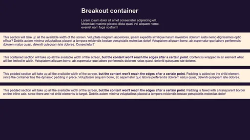 You can break an element out of this container by making it take up the whole screen’s width (100vw), then move it left by 50% of the container (which is the middle of the screen), minus half the screen’s width (50vw), effectively placing it on the very first horizontal pixel of the viewport.